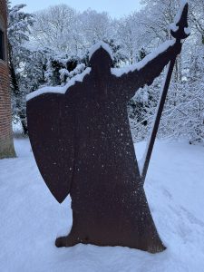 Seit gut einem Jahr bewacht unser stählerner Ritter die Burg. Er hat die Frühjahrsstürme überstanden, dem Besucheransturm beim Burggarten getrotzt, die Ritterkollegen bei der Mittelalterey